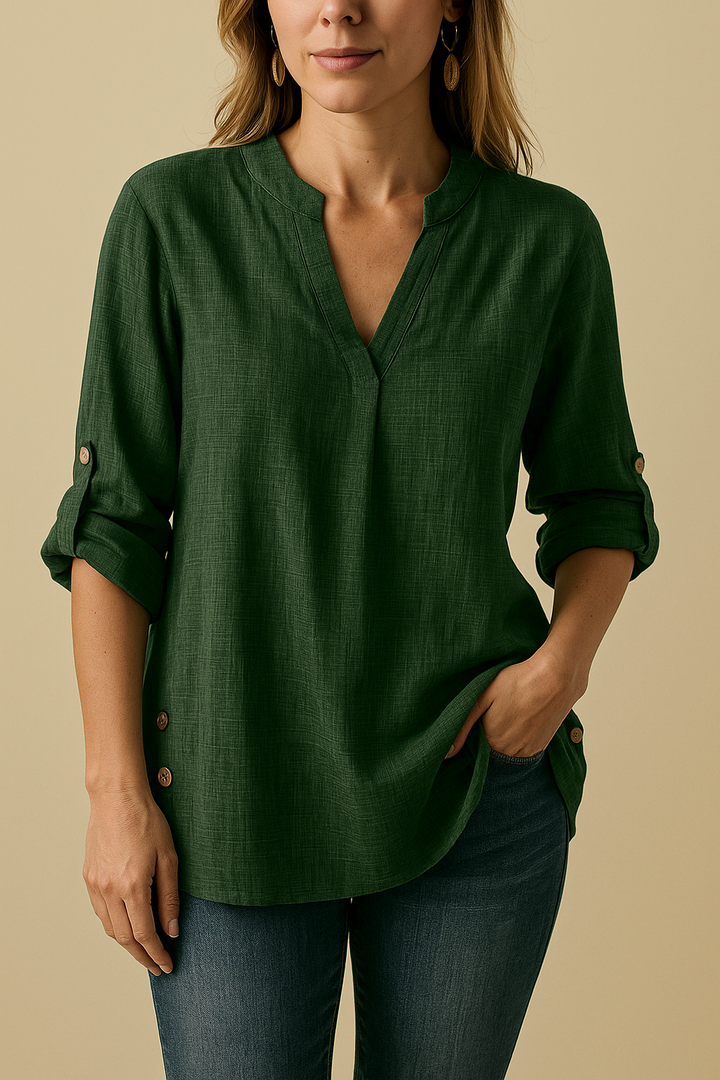 Okay, real talk: you need this blouse in your life. Period. It’s the ultimate addition to your wardrobe. It's comfy, cute, and totally versatile. You can wear it to class, to work, to brunch, to literally anything! It's like, the magical shirt that can do it all. Plus, the button details make it look way more expensive than it actually is – major slay! Don't even get me started on the V-neck, it's so flattering. Seriously, this blouse is a total vibe, and you'll be getting compliments left and right. Don't be a basic bestie, and level up your style game with this must-have blouse. Trust me, you won't regret it! This solid color blouse will be your go to.