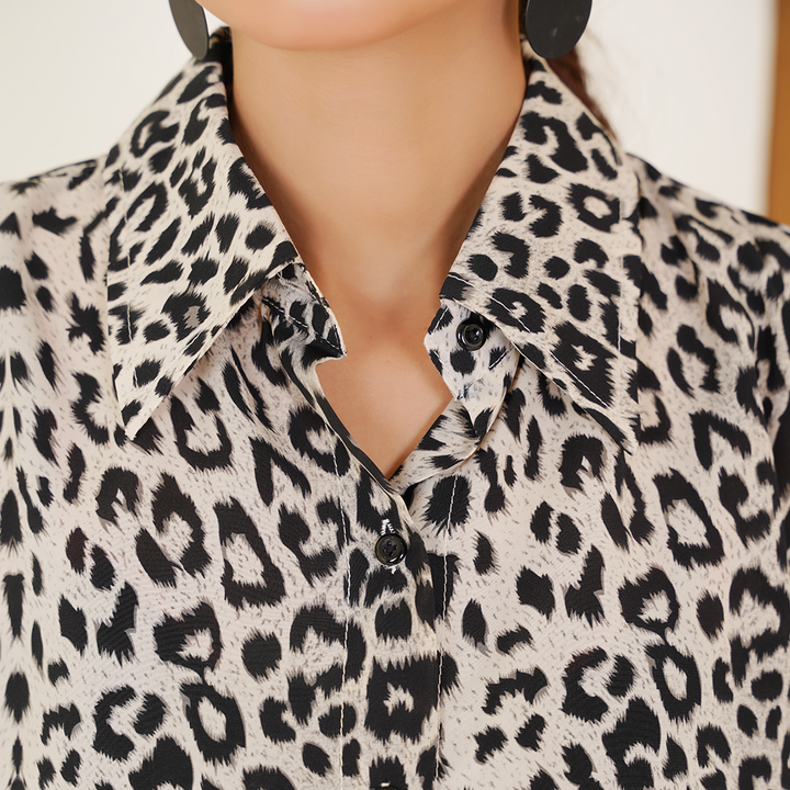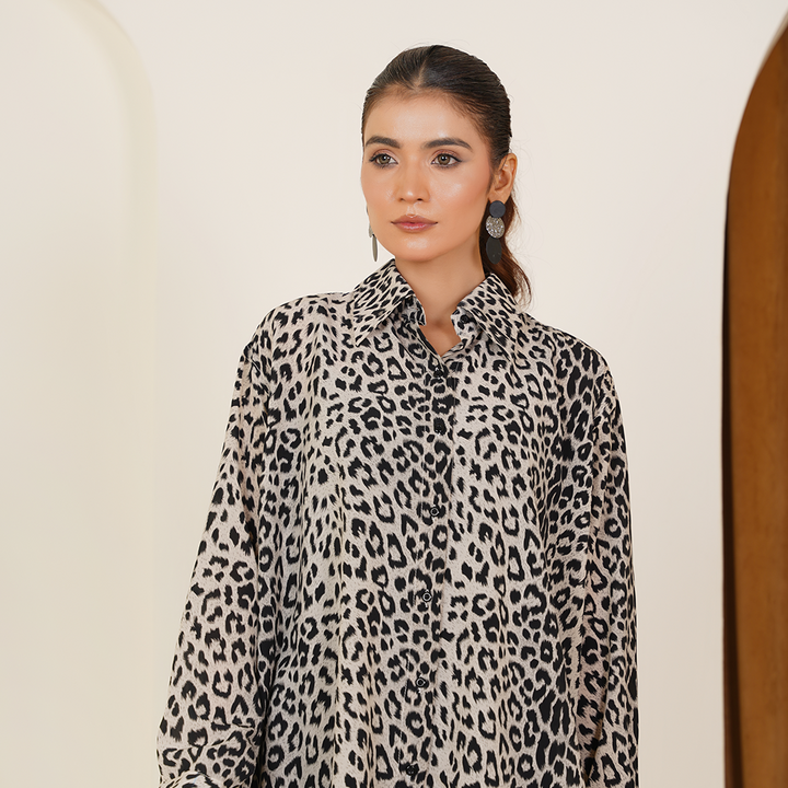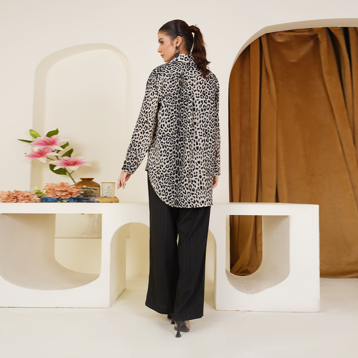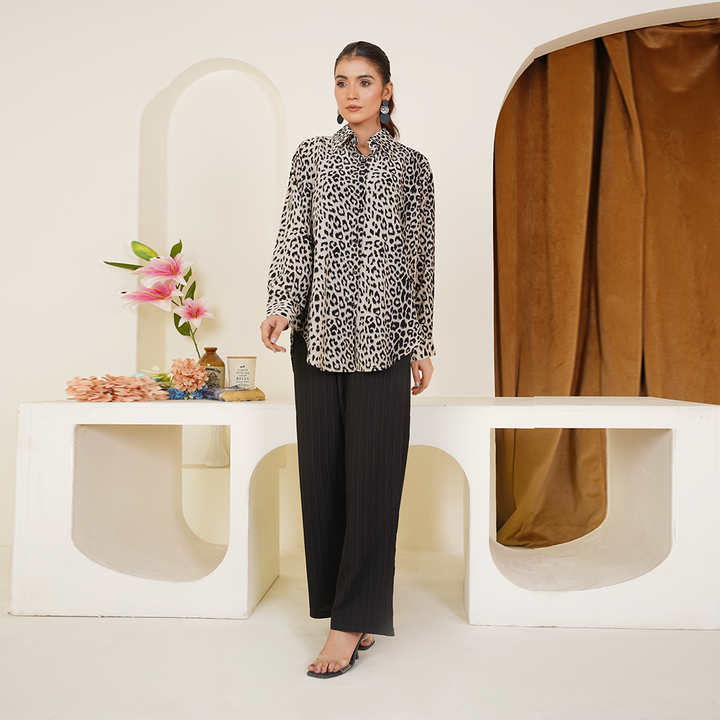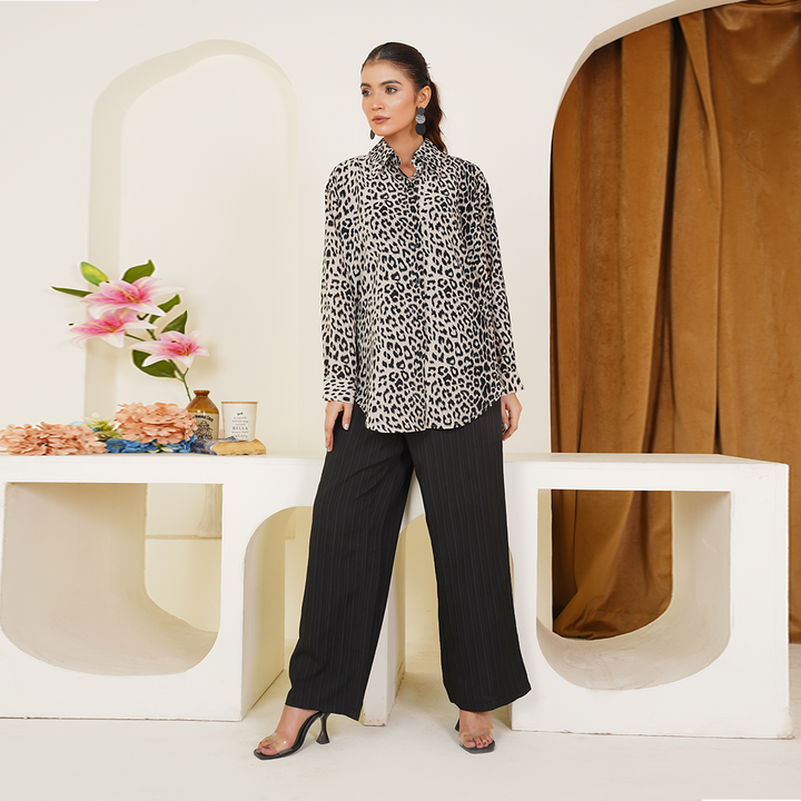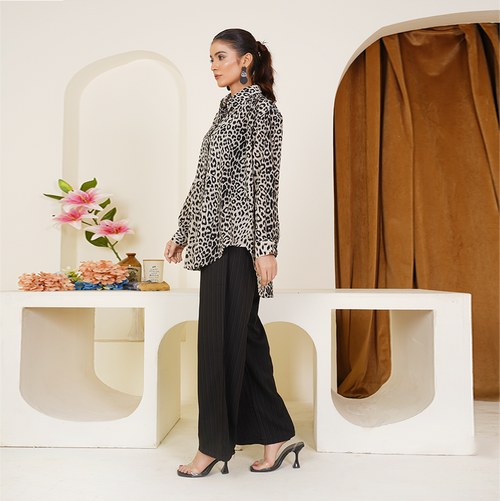 A chic black and white cheetah print top, tailored from soft, crinkle-free fabric, paired with textured black trousers. This stylish co-ord set blends comfort with a bold, contemporary vibe.
