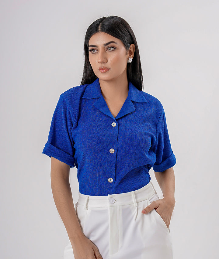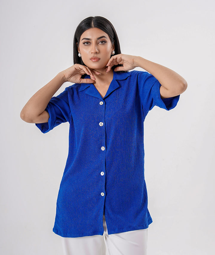 Long-sleeve, oversized button-down shirt with a pointed collar.