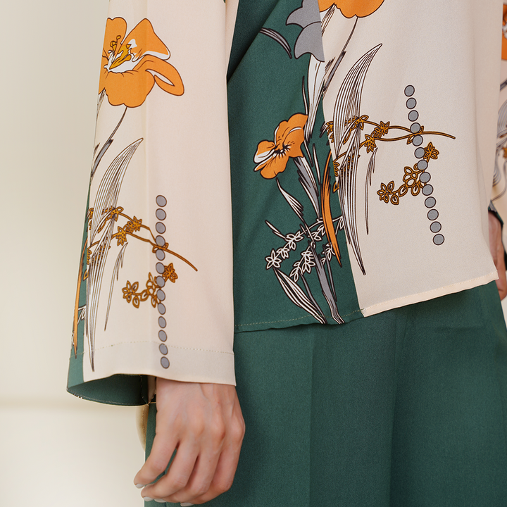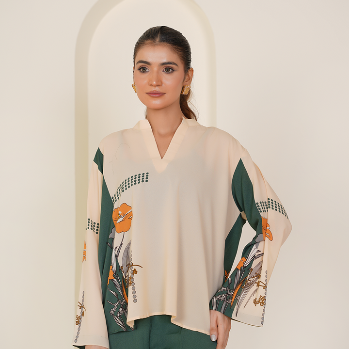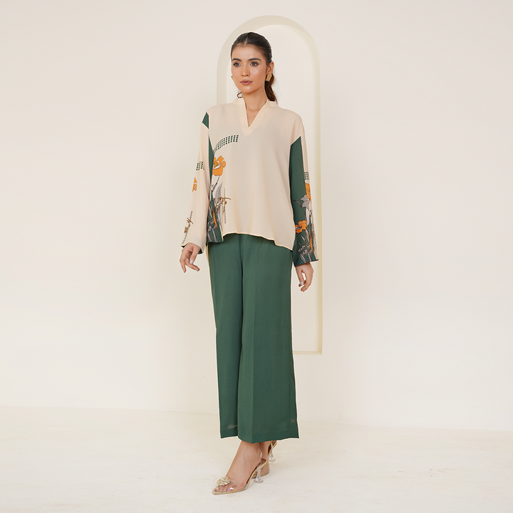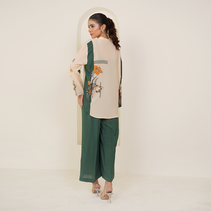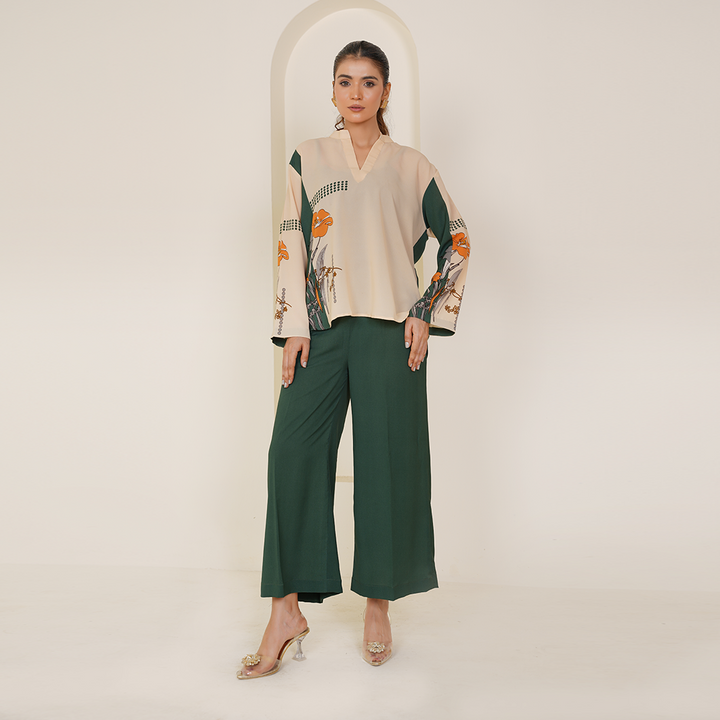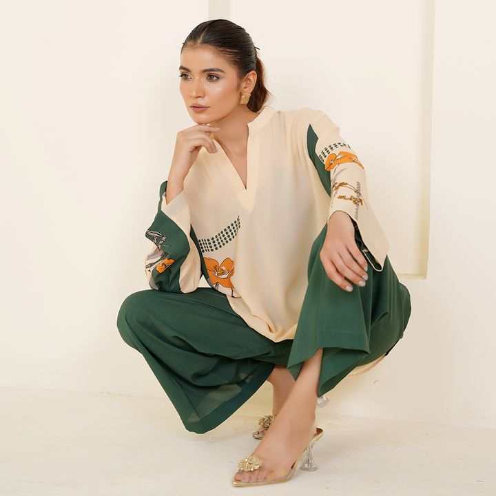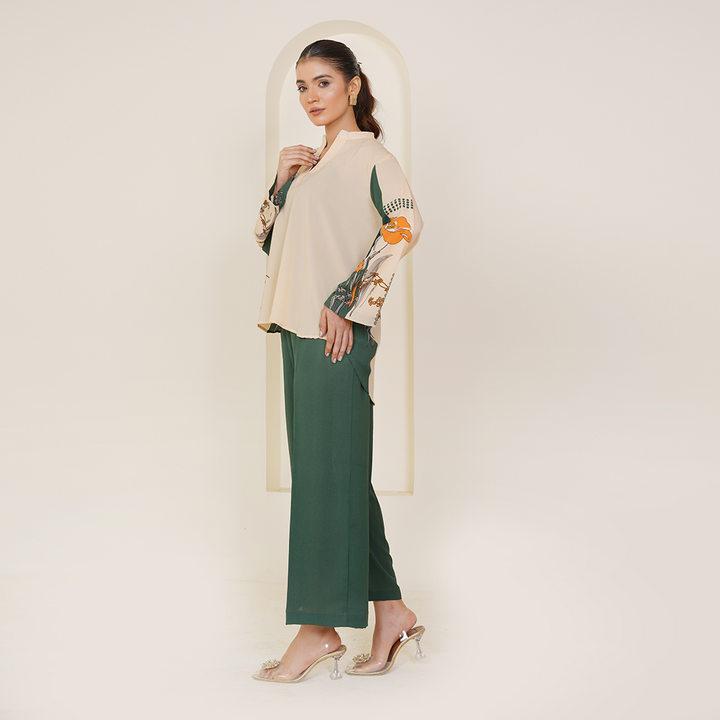 A lightweight fall fabric crafted for effortless summer wear, this elegant co-ord set combines a soothing fawn base with refreshing printed green accents, offering both style and comfort.