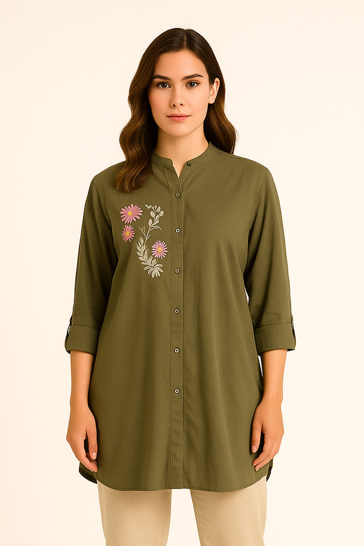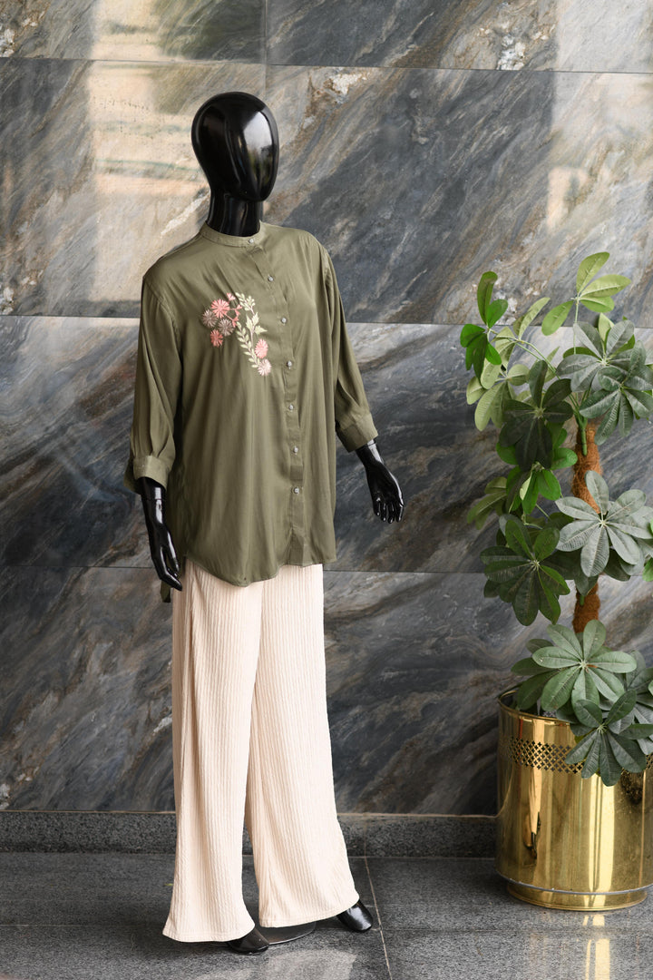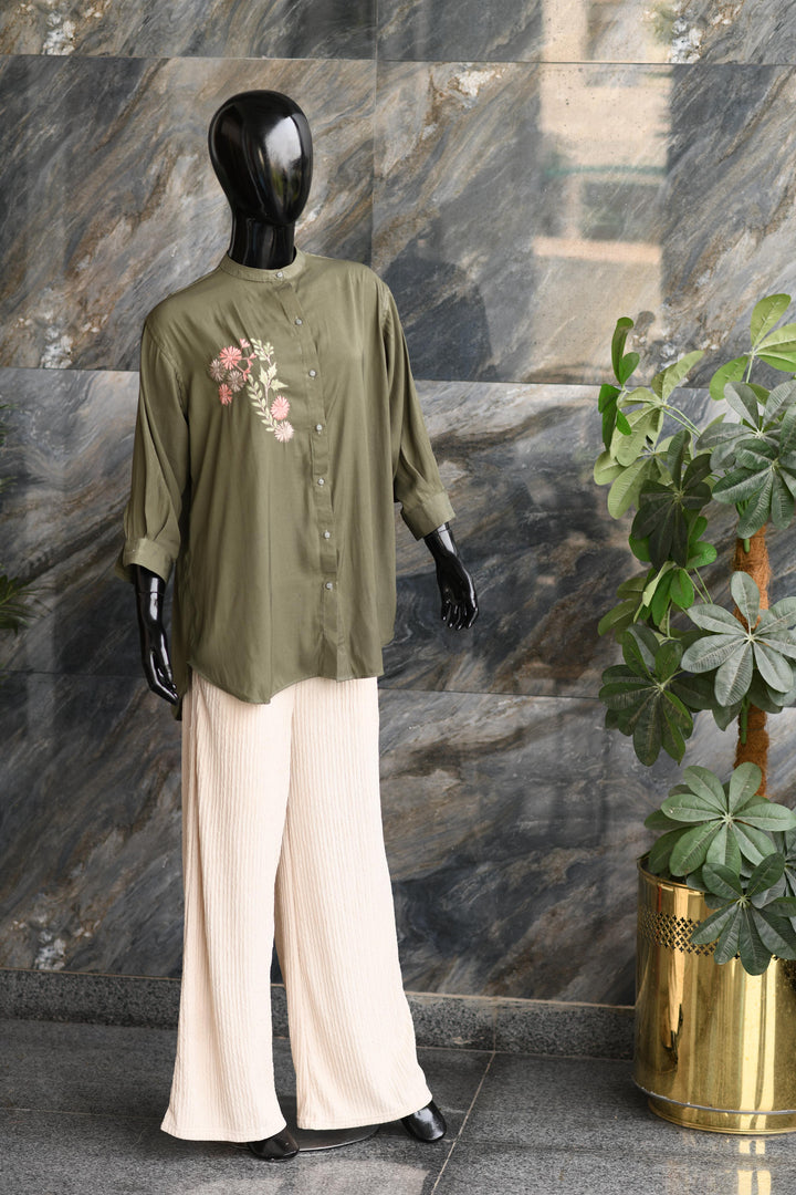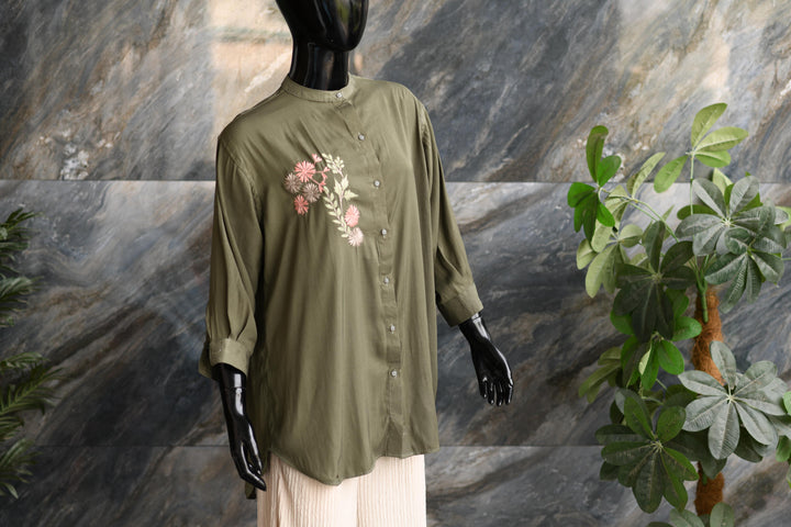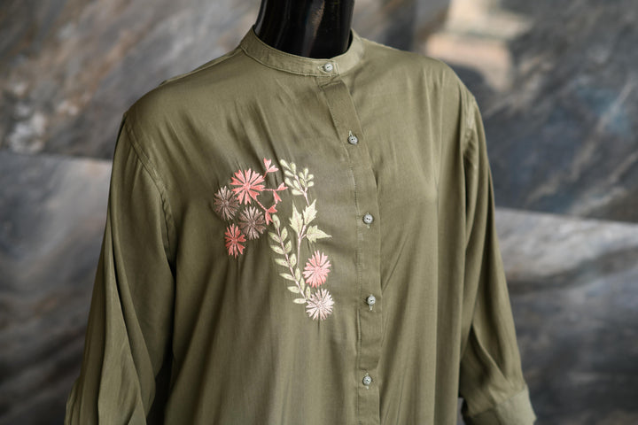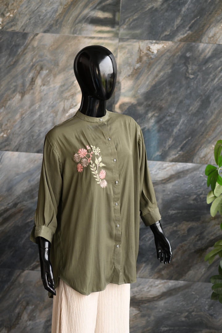 Green Shirt Button Down Shirt With An Embroidery Motive
