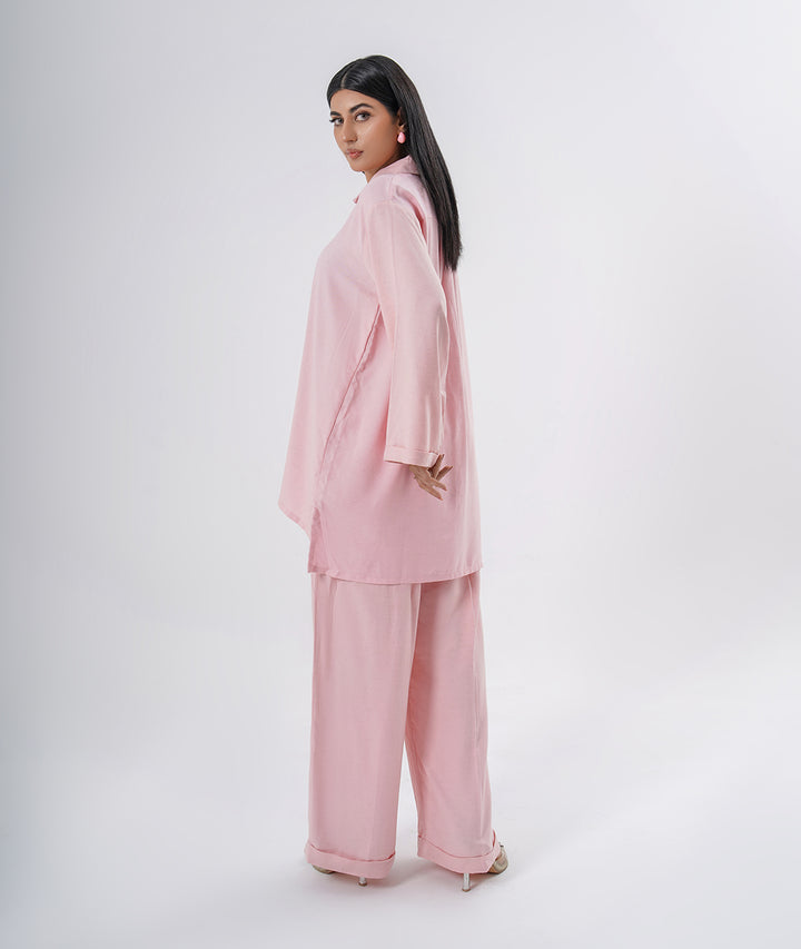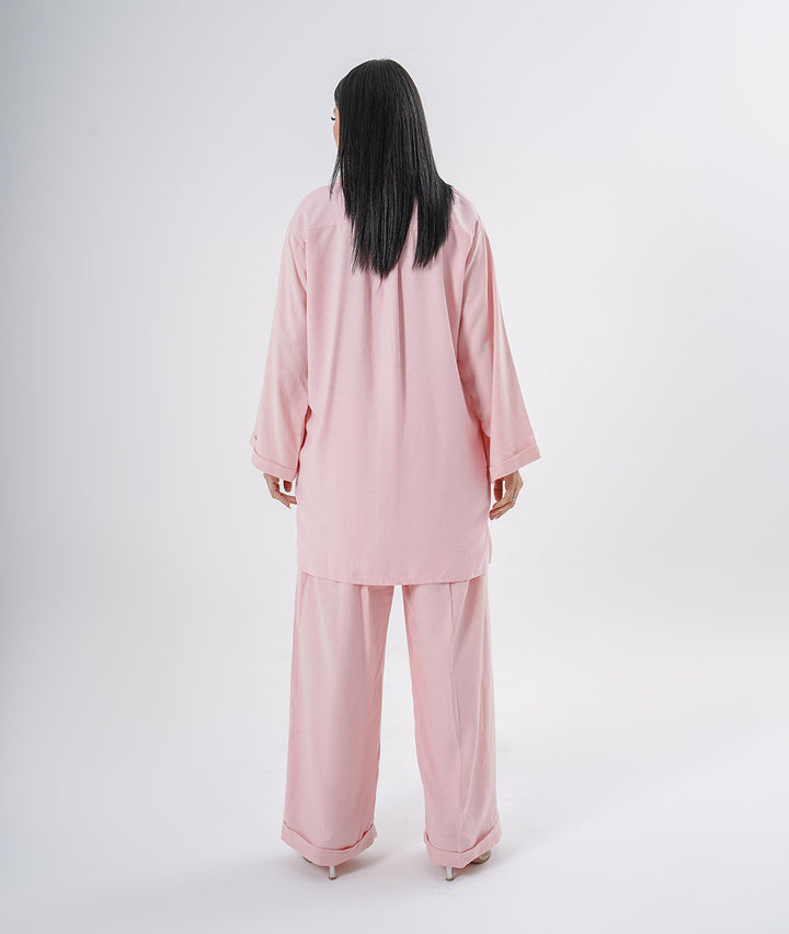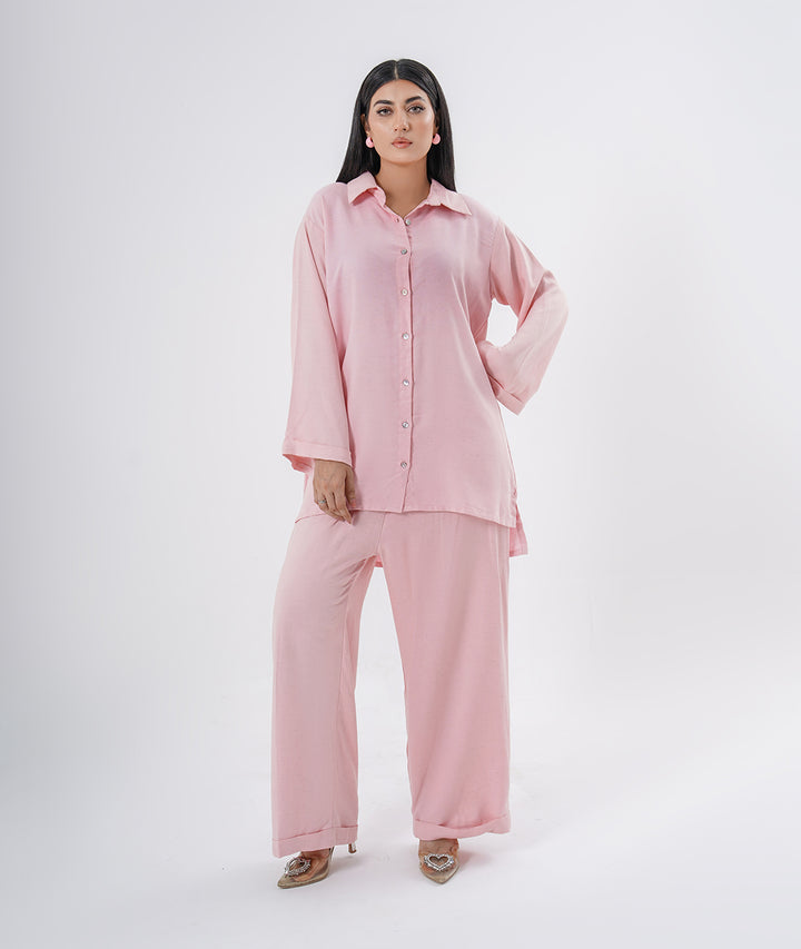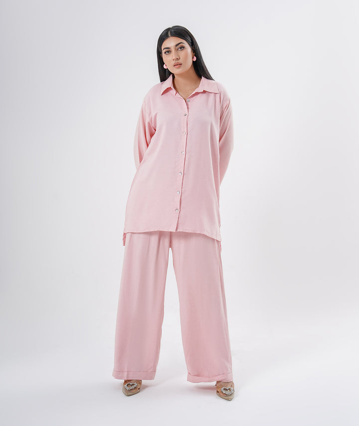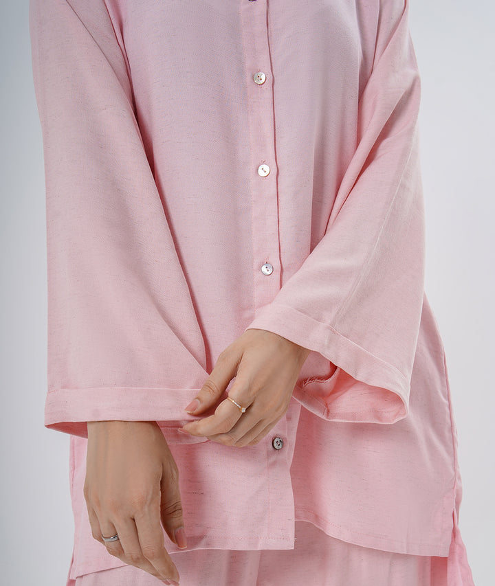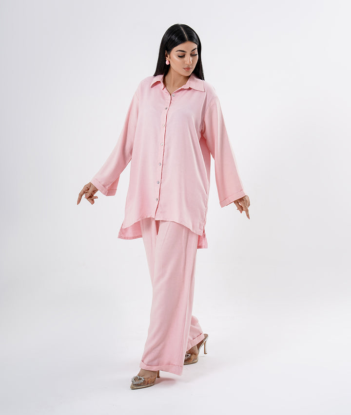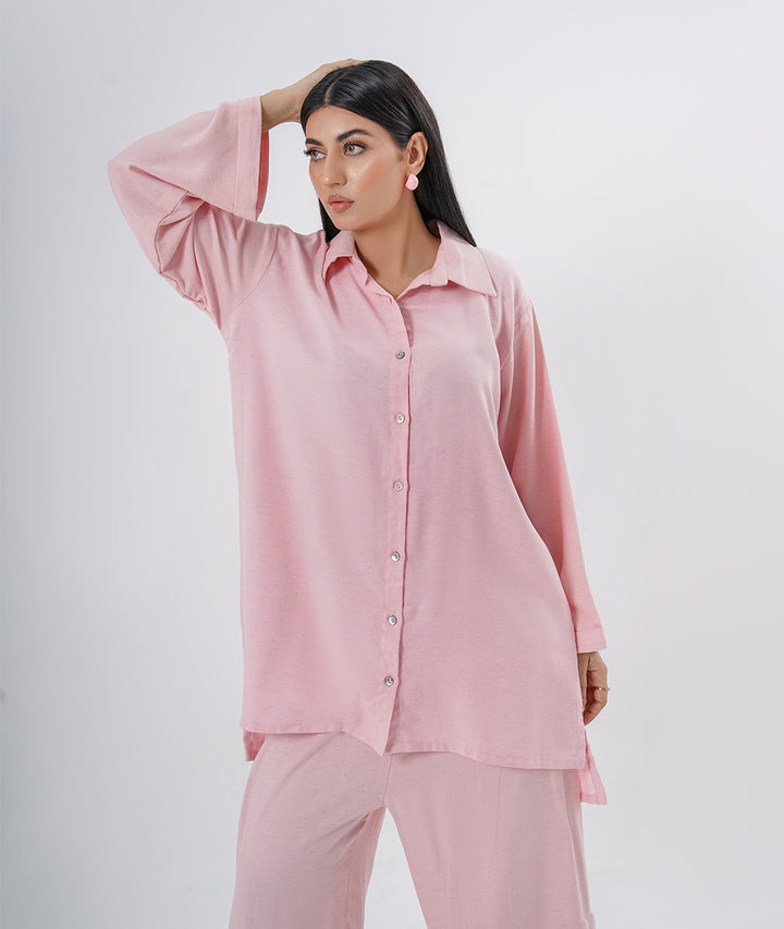 Long-sleeve, oversized button-down shirt with a pointed collar.