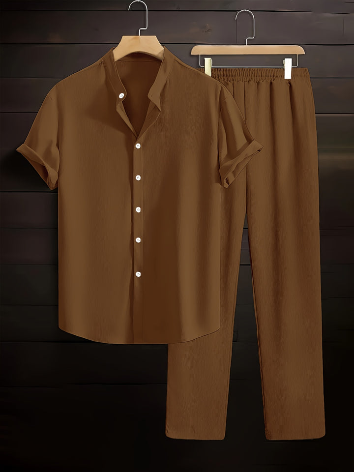Okay, listen up, because this [casual set] is seriously the vibe for summer. You know those days when you wanna look put-together but also like, effortlessly cool? This is it. The short-sleeve shirt with the stand collar? Major key. It's giving sophisticated, but still totally chill. The solid color keeps it classy, and the pleated detail? Chef's kiss. The pants are the perfect complement. They're comfy enough to wear all day, but still look fire for that impromptu sunset hangout with your crew. Seriously, this set is a whole mood.