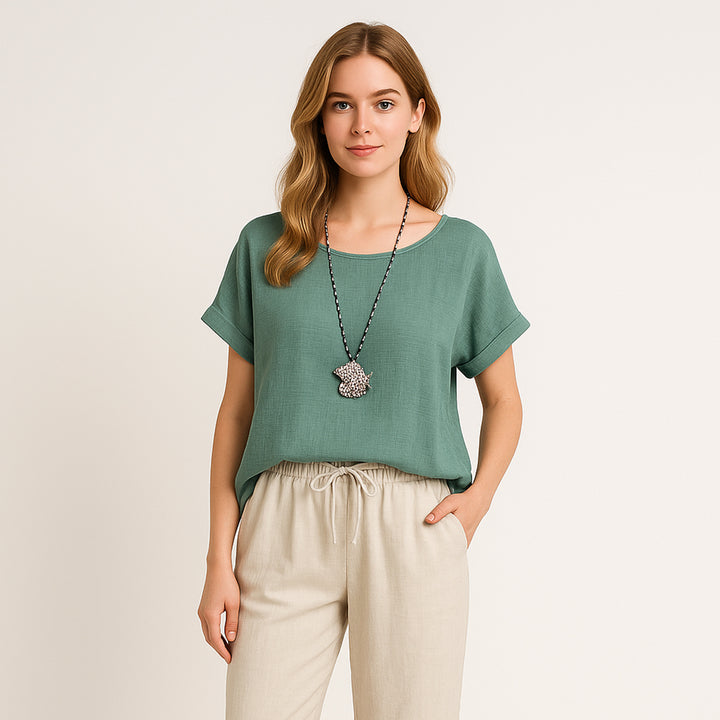 Okay, listen up. [You NEED this] tee in your life, like, yesterday. It's the closet staple you didn't know you were missing. This [solid color tee] is so versatile, you can create a million different looks with it. Plus, the pleated sleeves add a touch of elegance, so you’ll look boujee without even trying. But, the best part? It's actually comfy, like really comfy. Made from soft polyester, you'll feel like you're wearing a cloud. And let's be real, who doesn't love [no-iron clothes]? This tee is wrinkle-resistant, which means you can literally roll it up in your suitcase, and it'll still look fire when you unpack. For your closet needs, this crew neck is the way to go. Don't sleep on this one, babes! Trust me; your wardrobe will thank you.